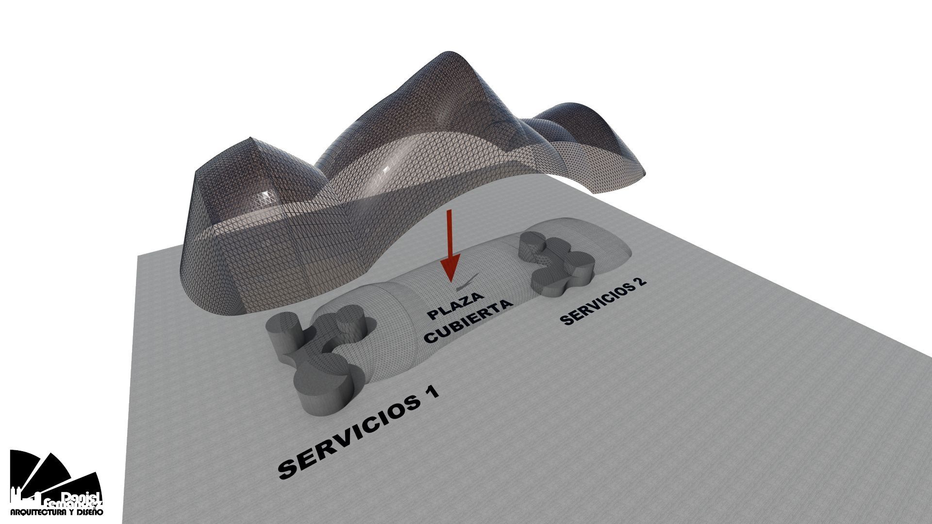 Proyecto teórico-experimental propio plasmado con carácter conceptual que expresa la relación de una plaza cubierta con servicios y su relación con el entorno abierto próximo.