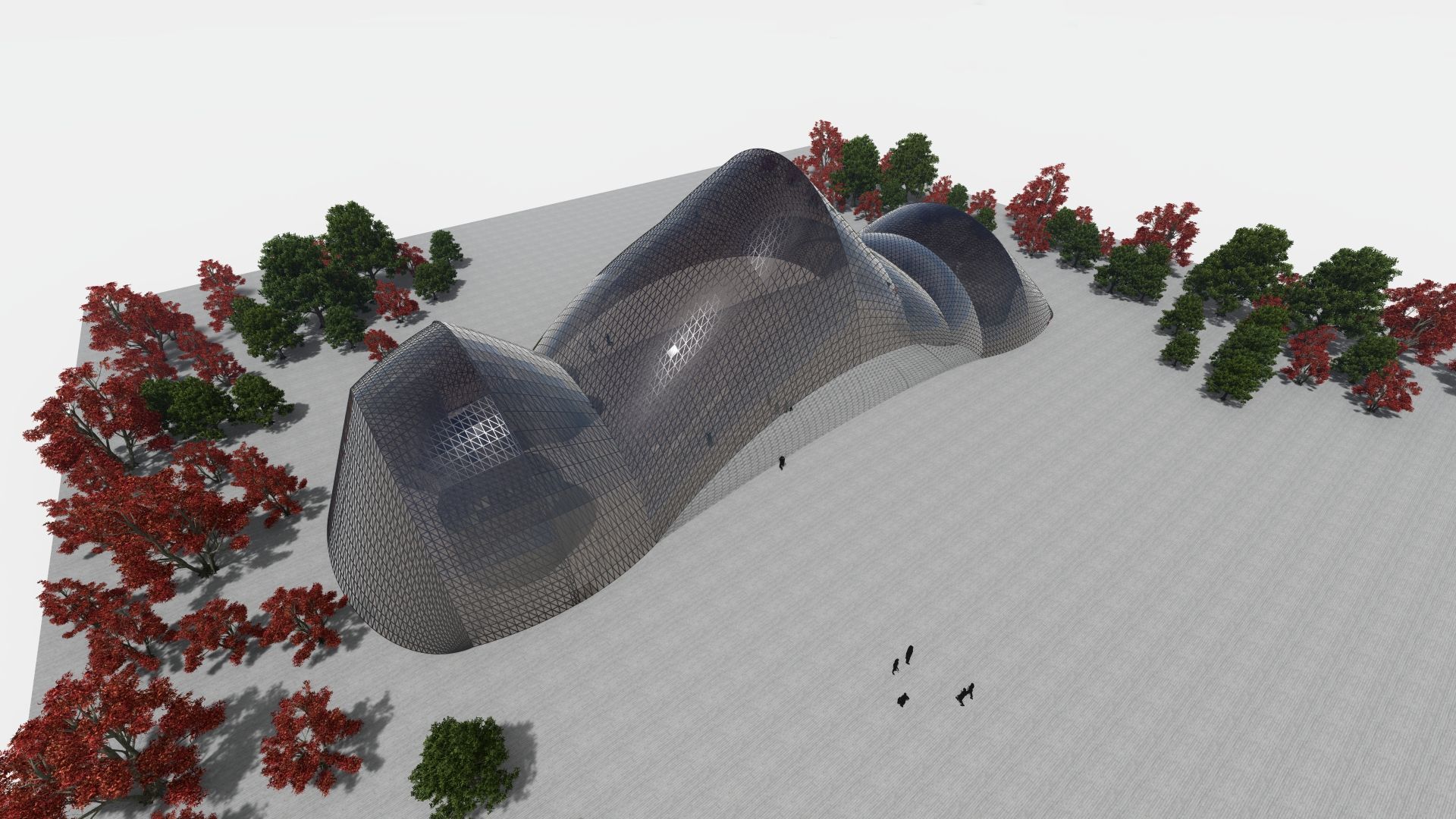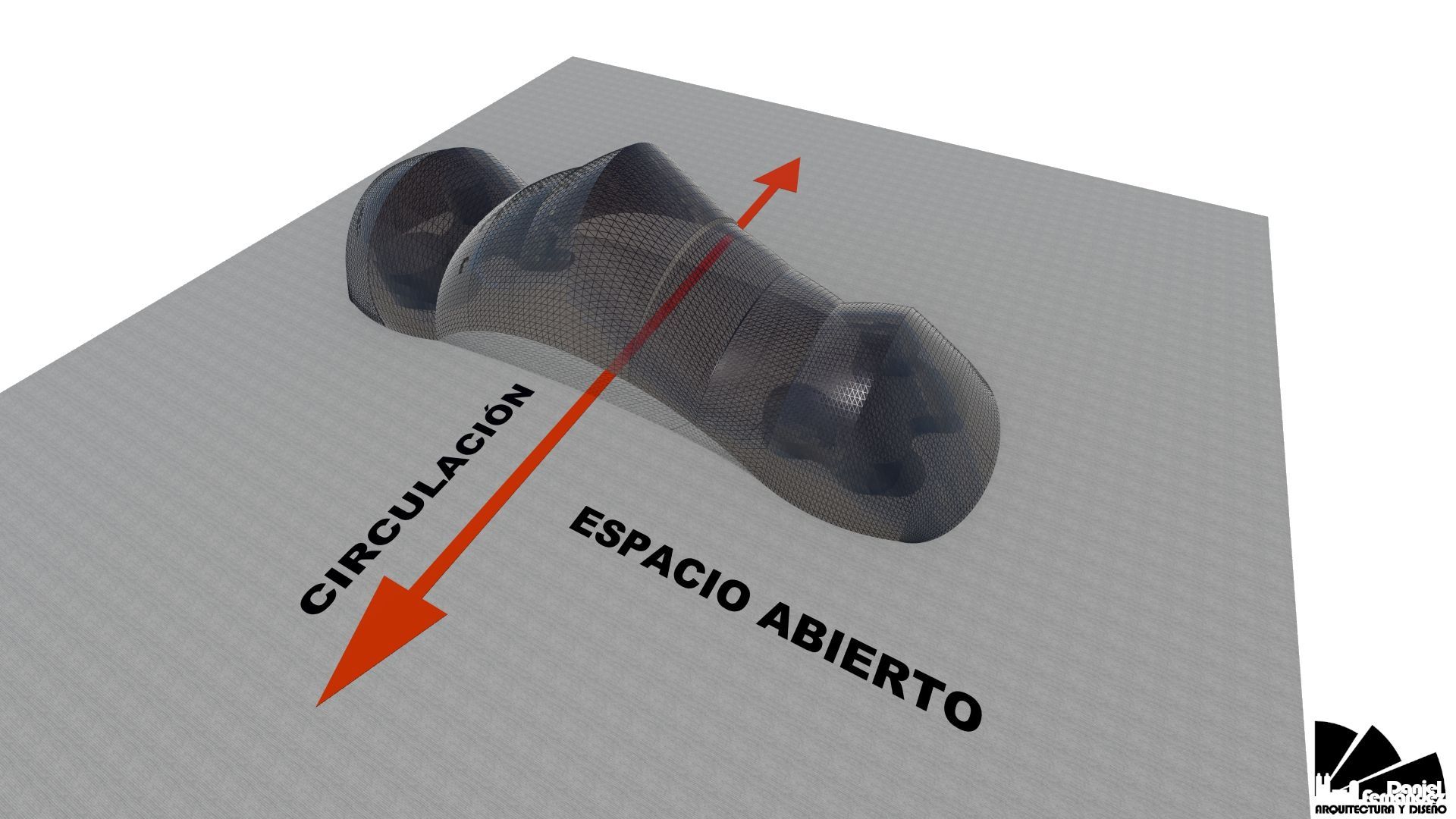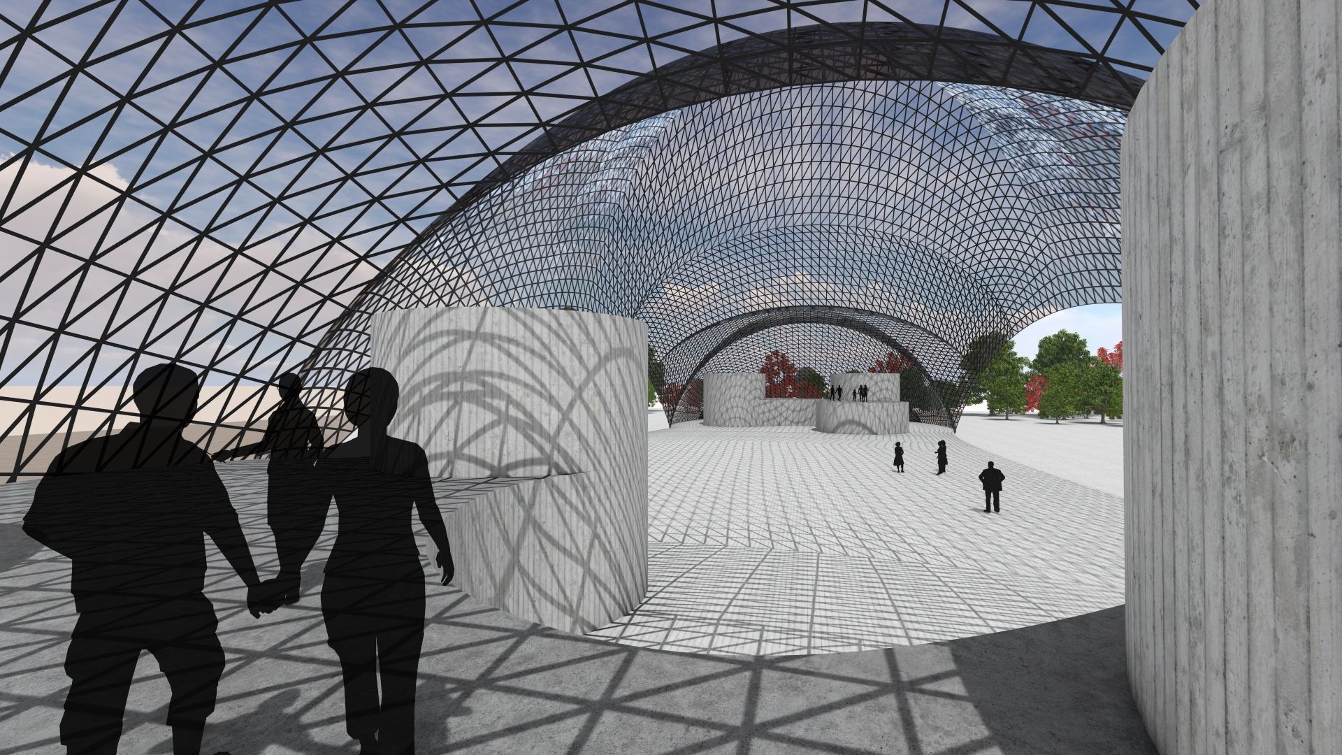Se plantea una arquitectura orgánica que dialoga con los elementos vegetales anexos, siendo una pieza arquitectónica conformada por una piel o caparazón transparente de acero y vidrio que se posiciona en el lugar, sobre los 2 núcleos interiores que albergan la función de servicios propios del pabellón (cafetería, aseos, almacenamiento, terrazas, etc...). Se origina una plaza cubierta en la que tienen lugar actividades diversas como salas de exposición efímeras, mítines, cine de verano, conciertos, etc... El conjunto permite la libre circulación y conexión con el resto de la plaza, generándose por tanto una relación exterior-interior gracias a una arquitectura porosa que favorece las relaciones sociales y visuales entre los usuarios que visiten el edificio. A nivel exterior se desarrollan áreas vegetales circundantes que dotan de llegada de la naturaleza al gran espacio de plaza (áreas de sombra, purificación de aire, embellecimiento visual, etc...), la cual cuenta con la misión fundamental de ser el contenedor de las actividades al aire libre y como punto de reunión.