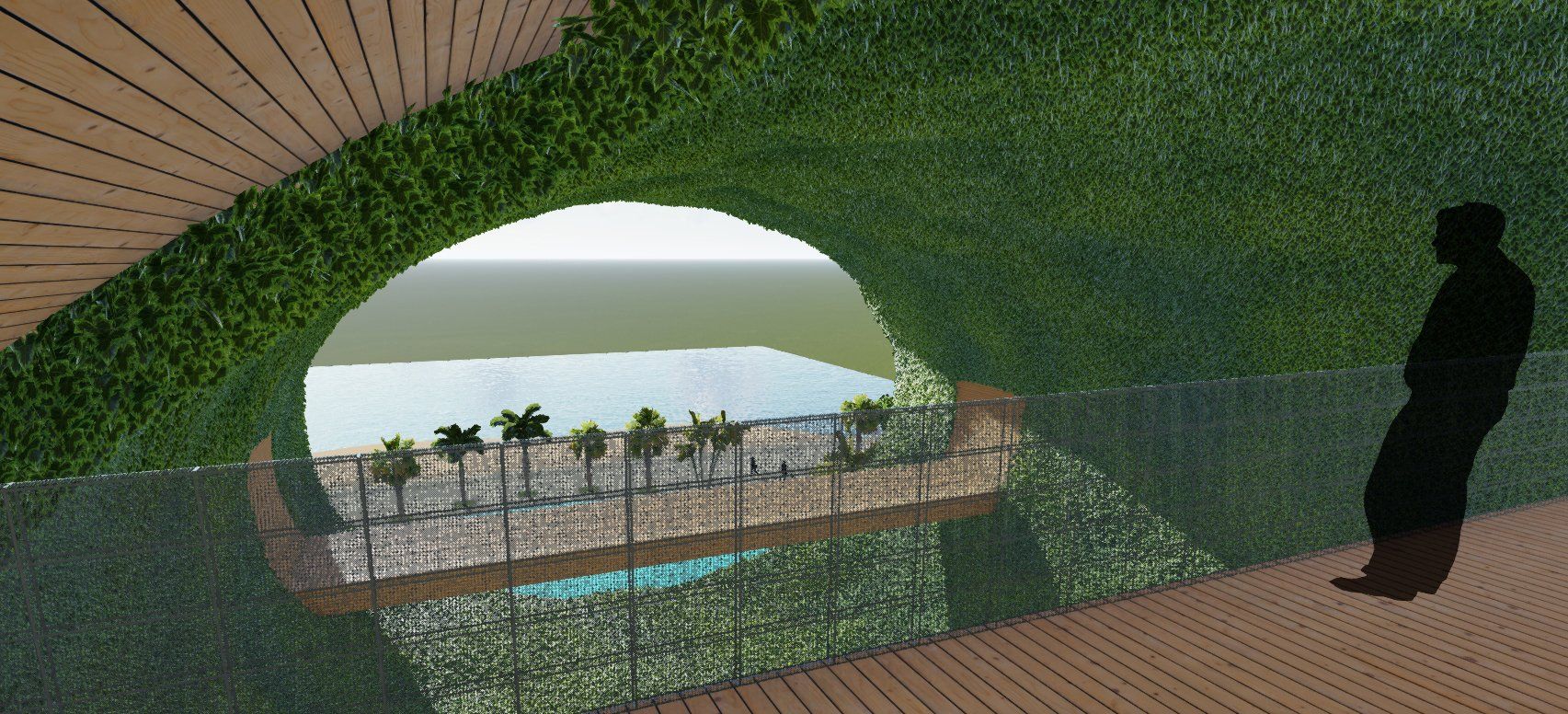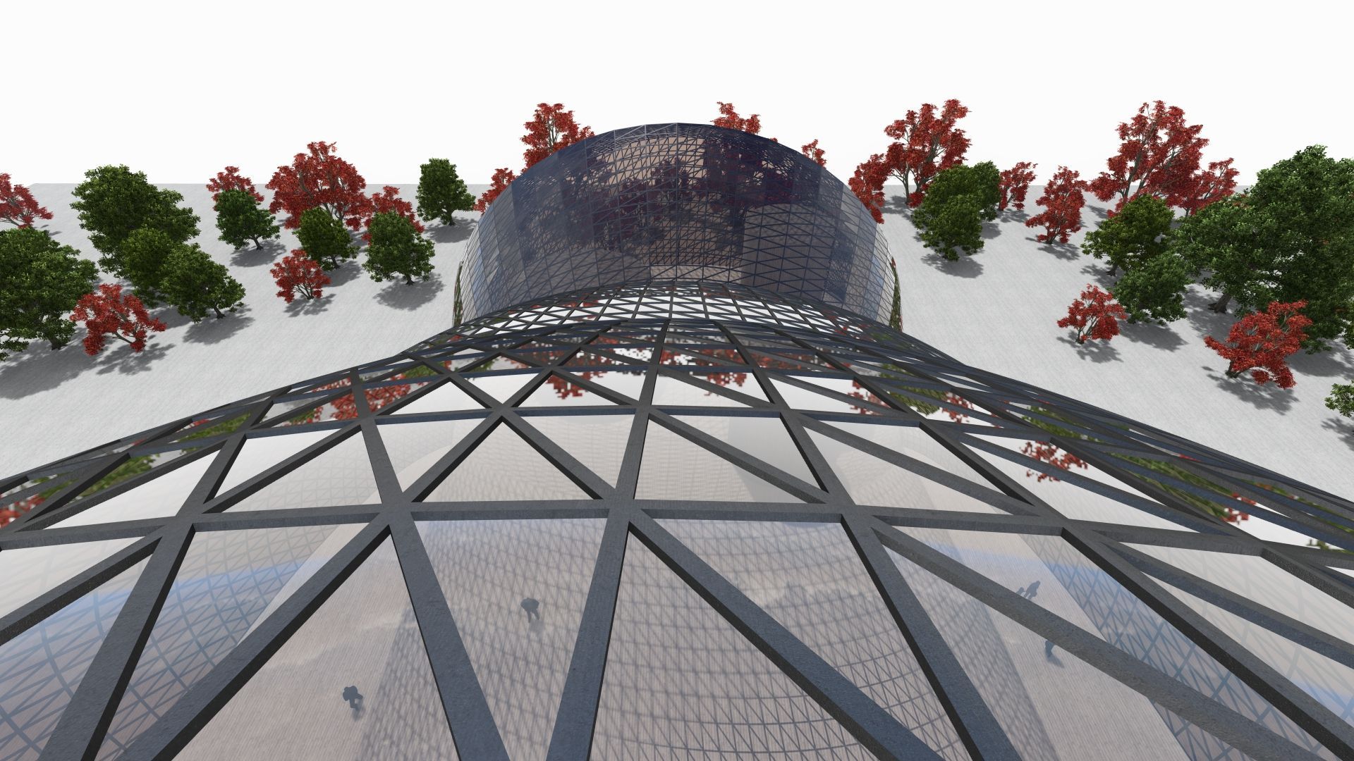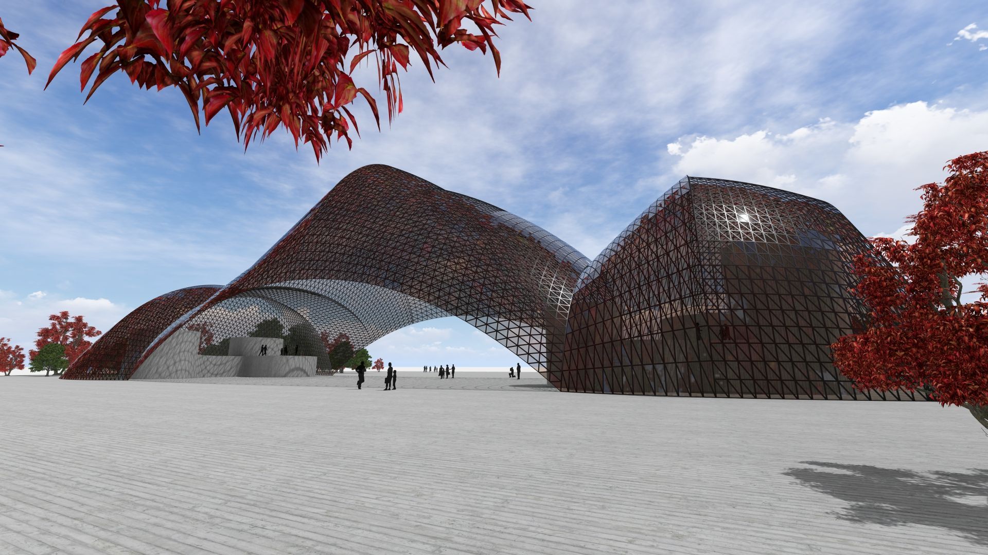 Se plantea una arquitectura orgánica que dialoga con los elementos vegetales anexos, siendo una pieza arquitectónica conformada por una piel o caparazón transparente de acero y vidrio que se posiciona en el lugar, sobre los 2 núcleos interiores que albergan la función de servicios propios del pabellón (cafetería, aseos, almacenamiento, terrazas, etc...). Se origina una plaza cubierta en la que tienen lugar actividades diversas como salas de exposición efímeras, mítines, cine de verano, conciertos, etc... El conjunto permite la libre circulación y conexión con el resto de la plaza, generándose por tanto una relación exterior-interior gracias a una arquitectura porosa que favorece las relaciones sociales y visuales entre los usuarios que visiten el edificio. A nivel exterior se desarrollan áreas vegetales circundantes que dotan de llegada de la naturaleza al gran espacio de plaza (áreas de sombra, purificación de aire, embellecimiento visual, etc...), la cual cuenta con la misión fundamental de ser el contenedor de las actividades al aire libre y como punto de reunión.