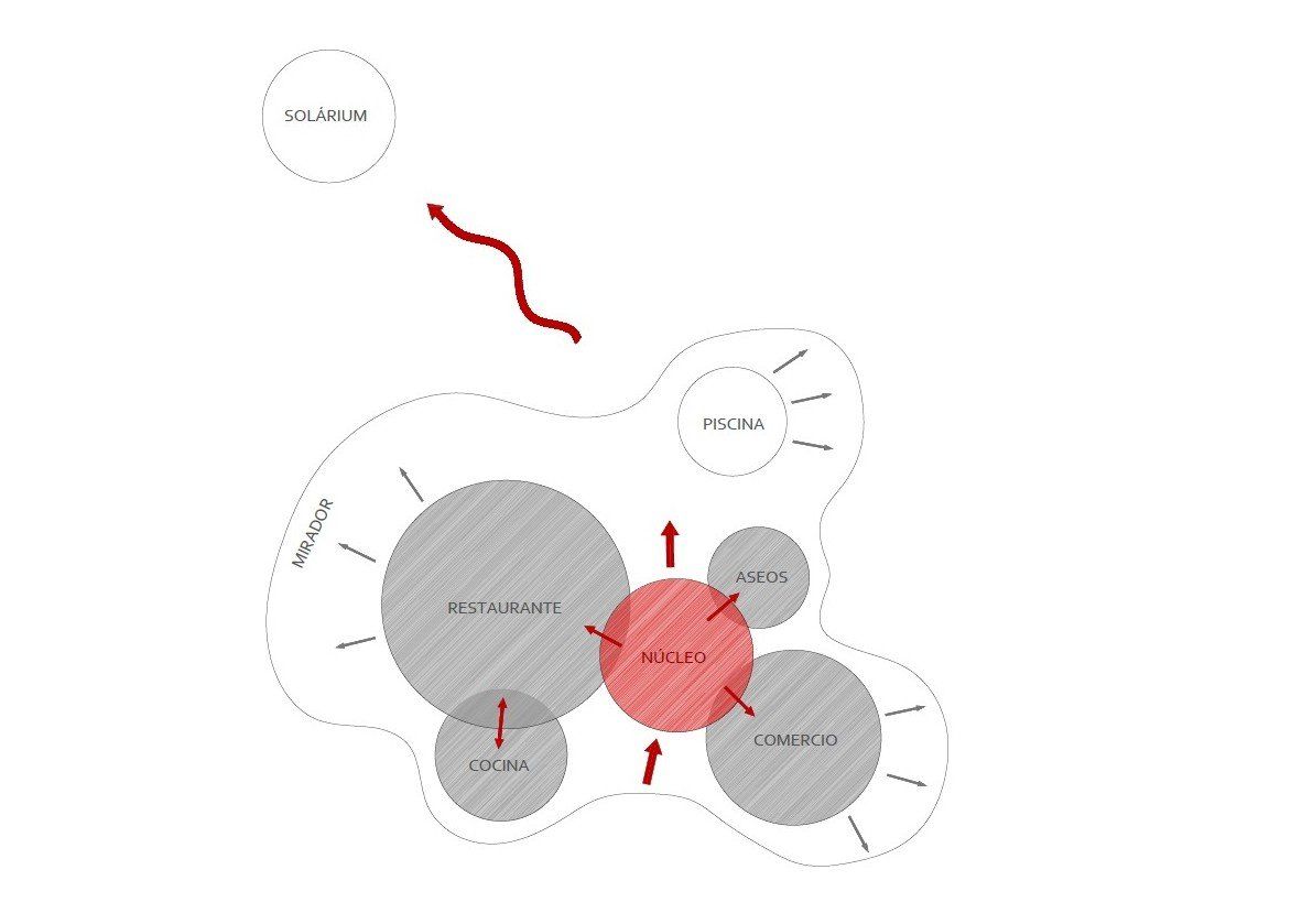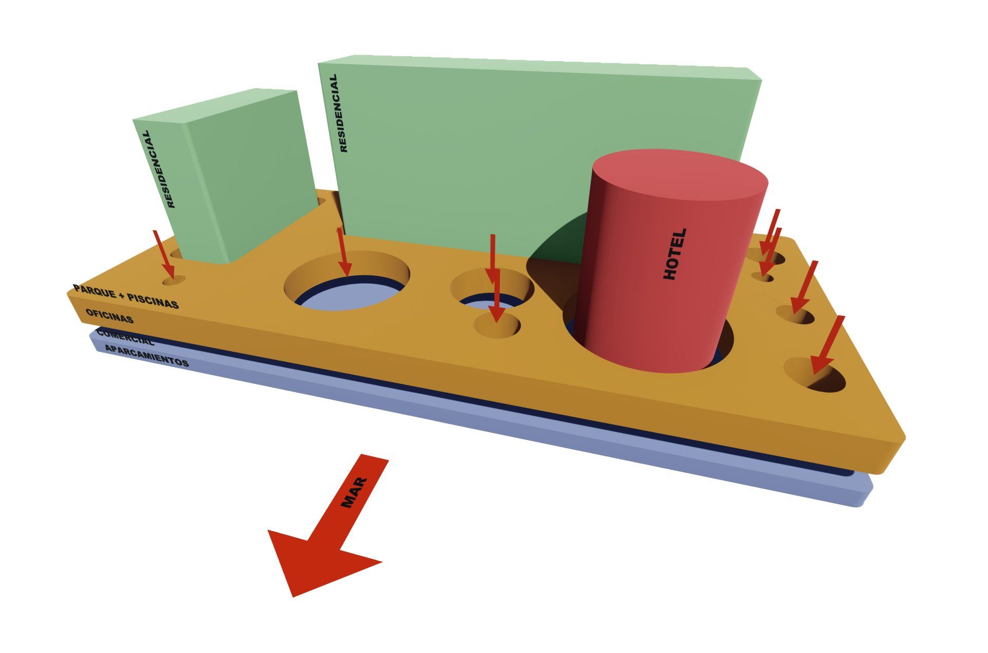 El conjunto se organiza a partir de la idea de una masa flotante con uso de oficinas que es atravesada por unos prismas verticales con unas funciones determinadas de residencial y hotel, orientándose de tal manera que abrazan su espacio interior principal de parque + piscinas, y se abren al paisaje, la costa del mar Mediterráneo. Bajo la mencionada masa flotante se organiza el espacio comercial cubierto, con posibilidades de comunicación con el resto del entorno urbano existente. A nivel soterrado se localiza el área de aparcamiento de las funciones superiores.