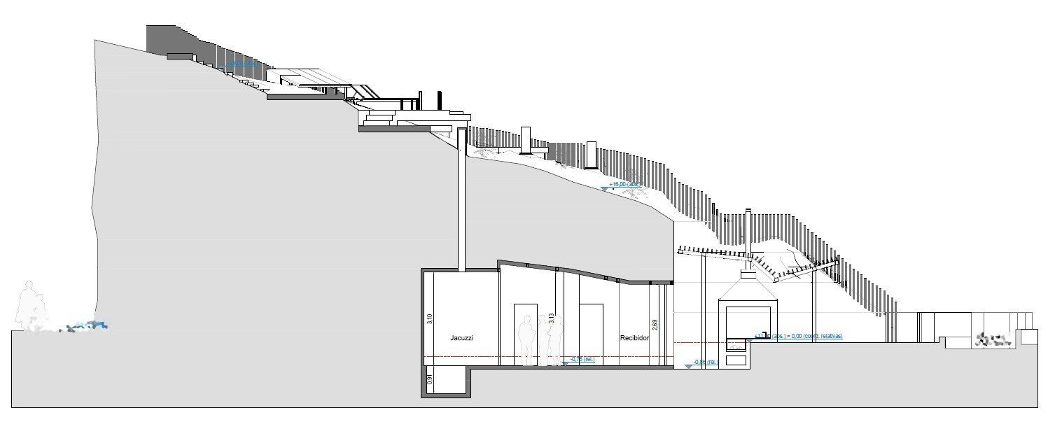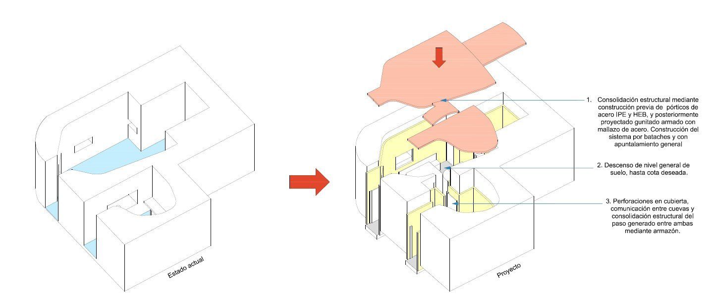 Proyecto de rehabilitación de cuevas existentes ubicadas en la zona de La Viuda en la que se pone en valor las características intrínsecas a las cuevas, así como del paisaje exterior con un marcado carácter costero. Exteriormente un conjunto de plataformas con distintos usos asociados garantizan el disfrute del lugar en un planteamiento arquitectónico que busca el maclaje con el paisaje. Interiormente las cuevas se rehabilitan albergando un espacio de vivienda, respetando la identidad excavada y mejorando las prestaciones con la inserción de luz natural a partir de tubos solares.