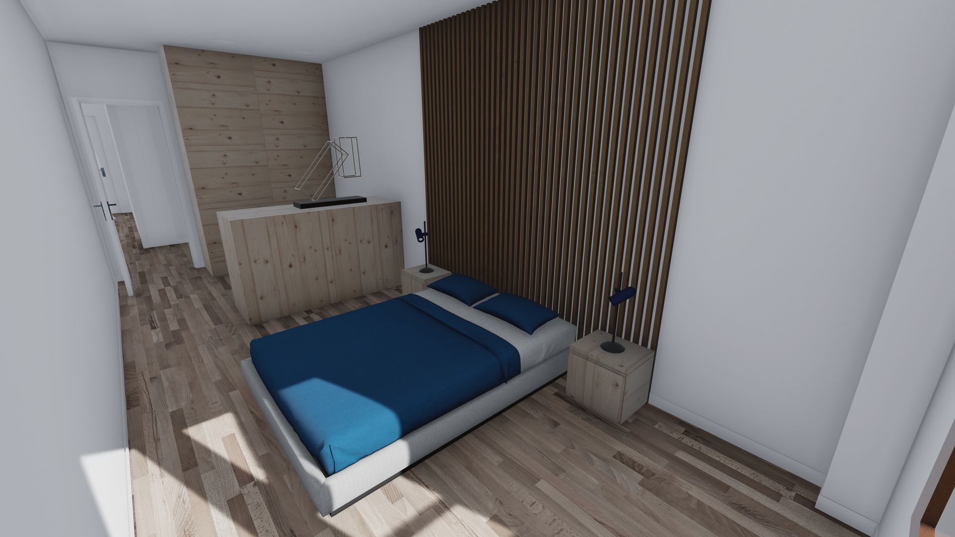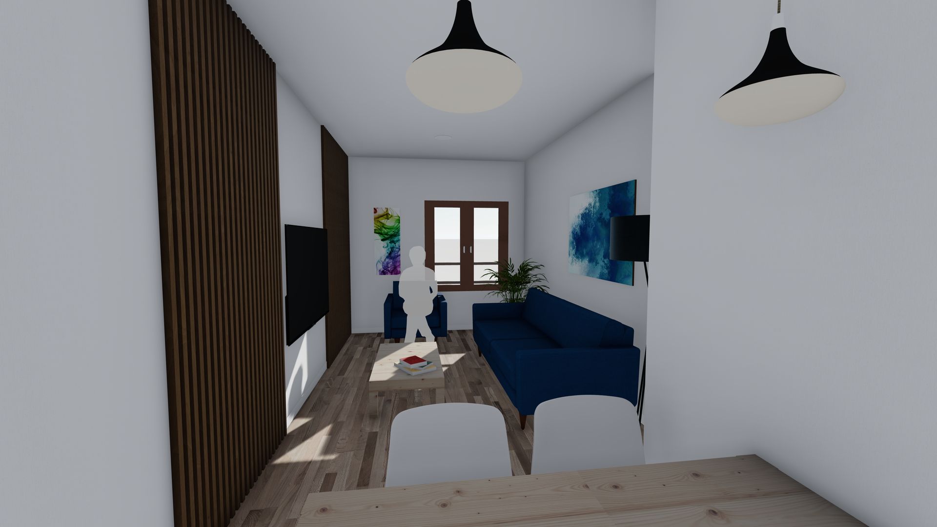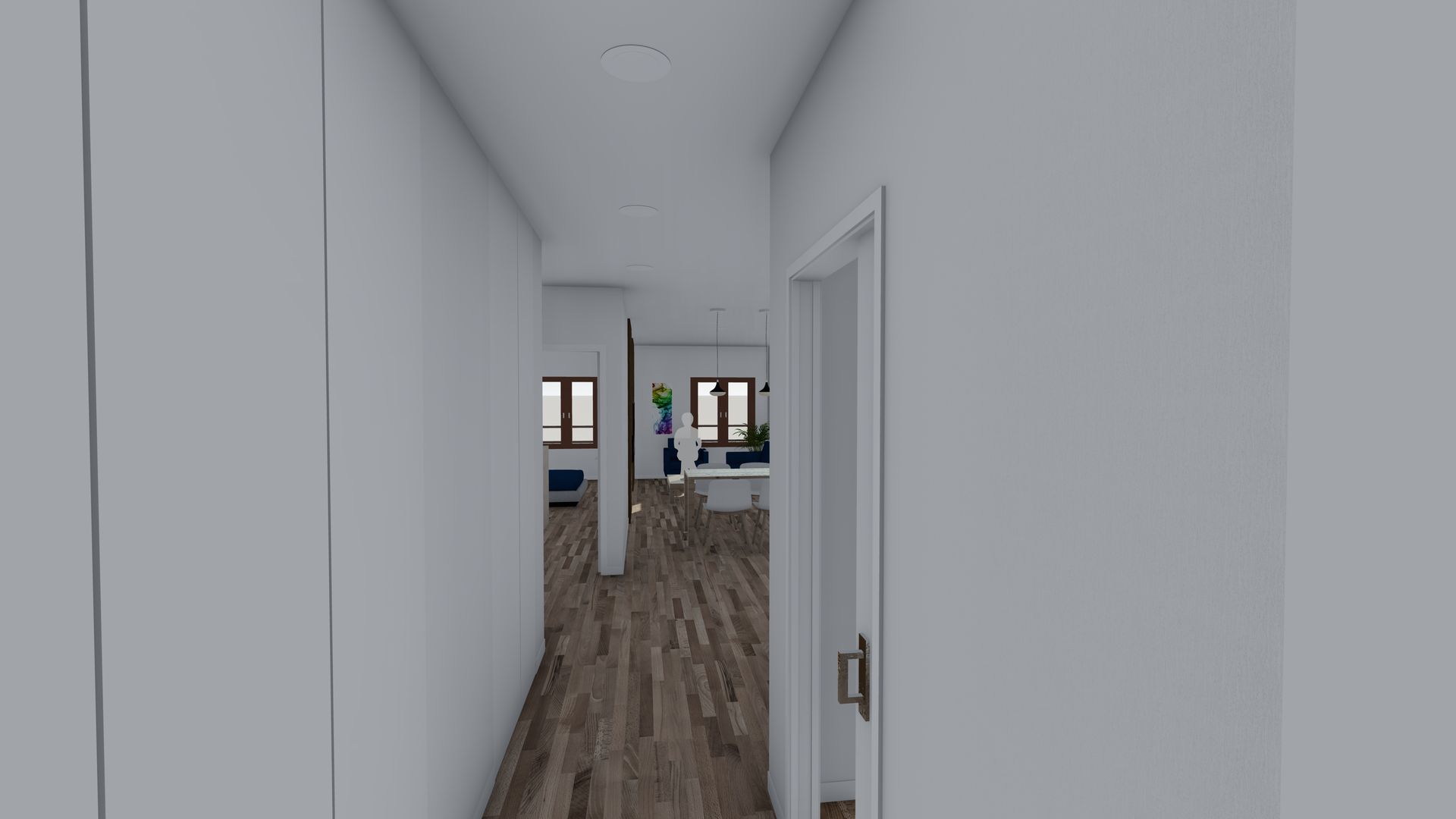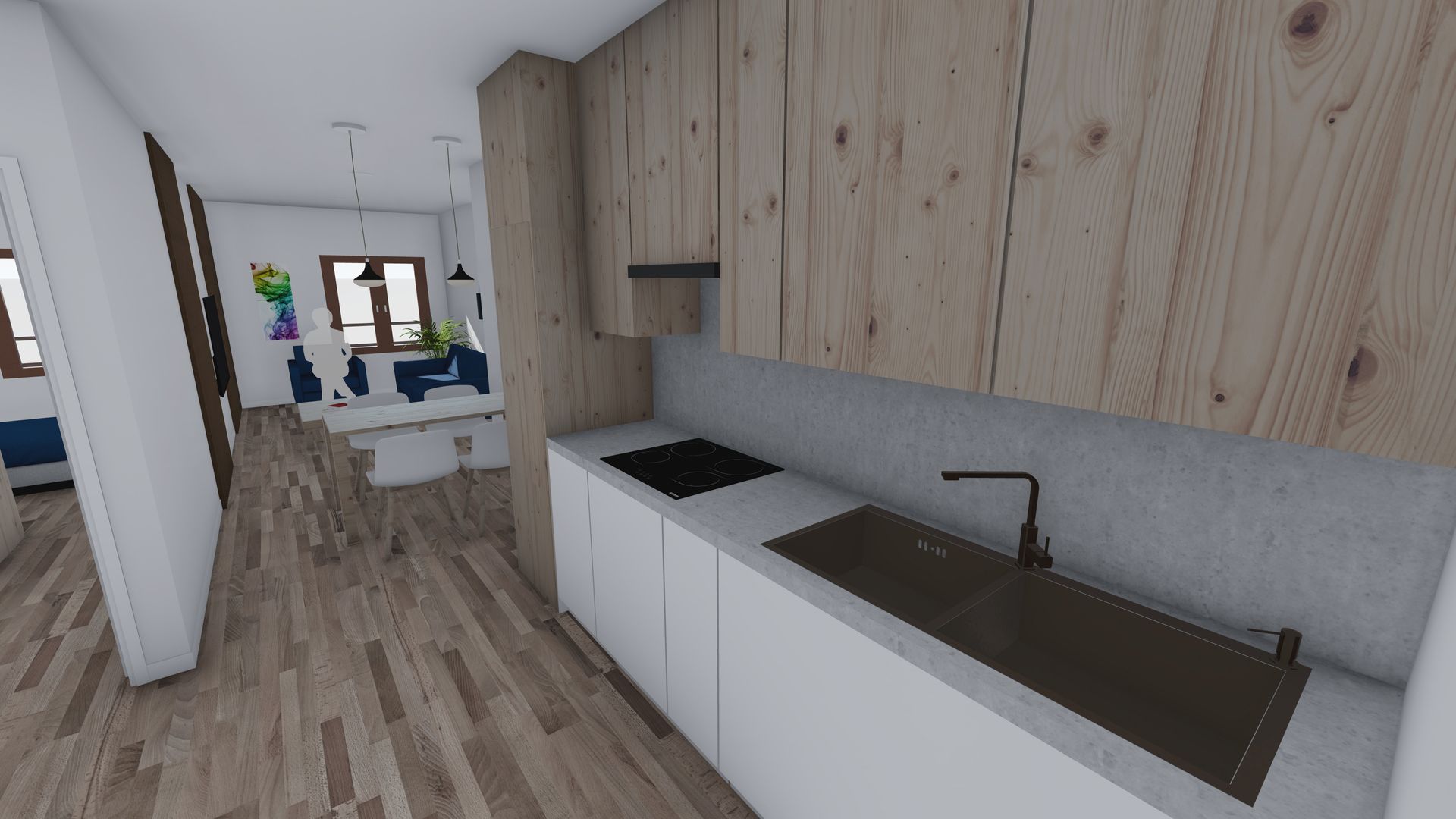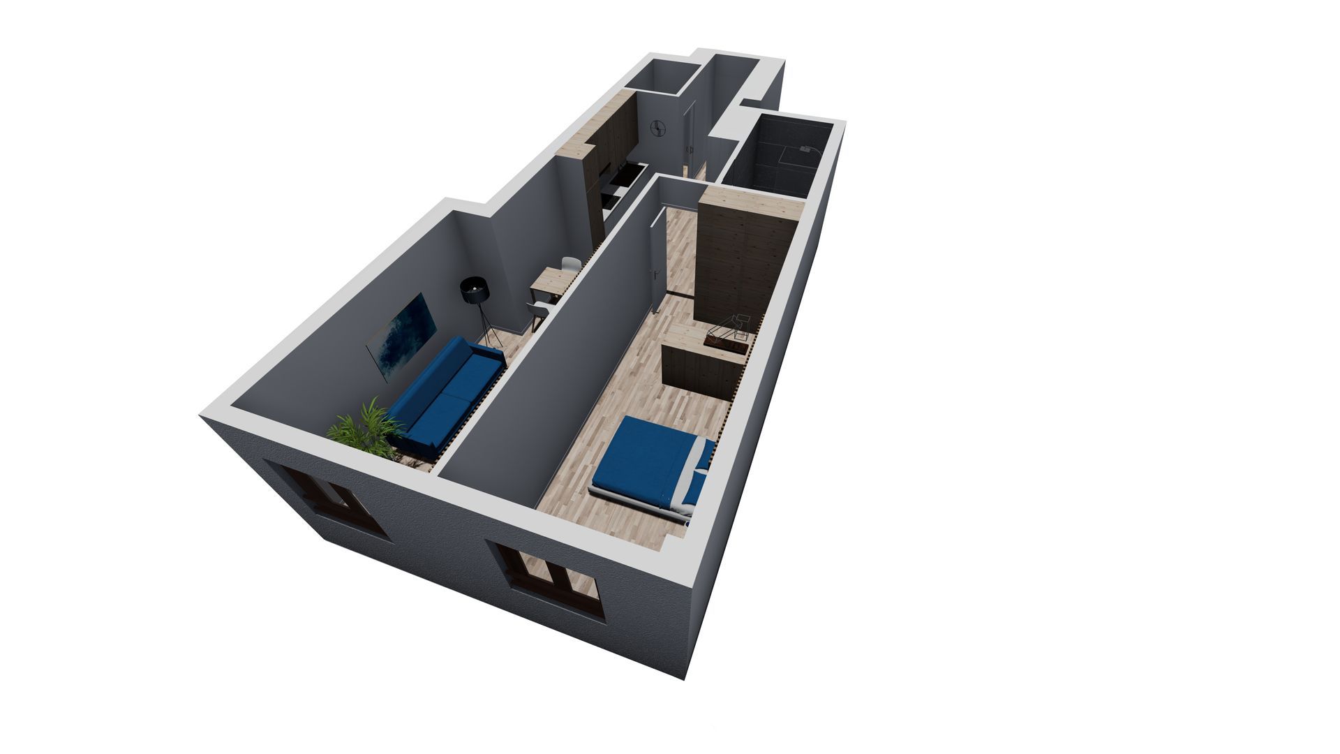 Creación de infografías a partir de planteamiento de Proyecto proporcionado, el cual parte de la base de la transformación de un área de oficina a apartamento, plasmando área de salón y dormitorio hacia fachada, y baño, cocina y almacenamiento junto el espacio de entrada anexo a pasillo común.