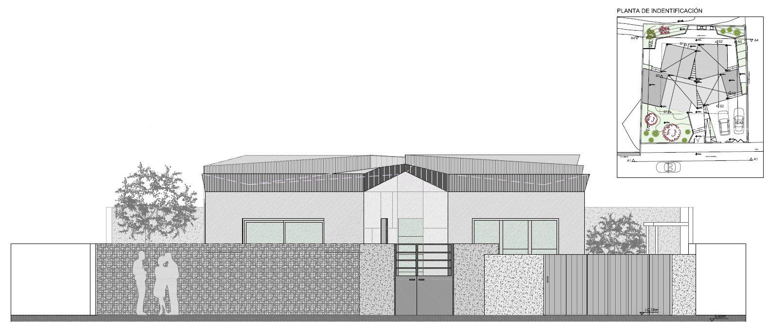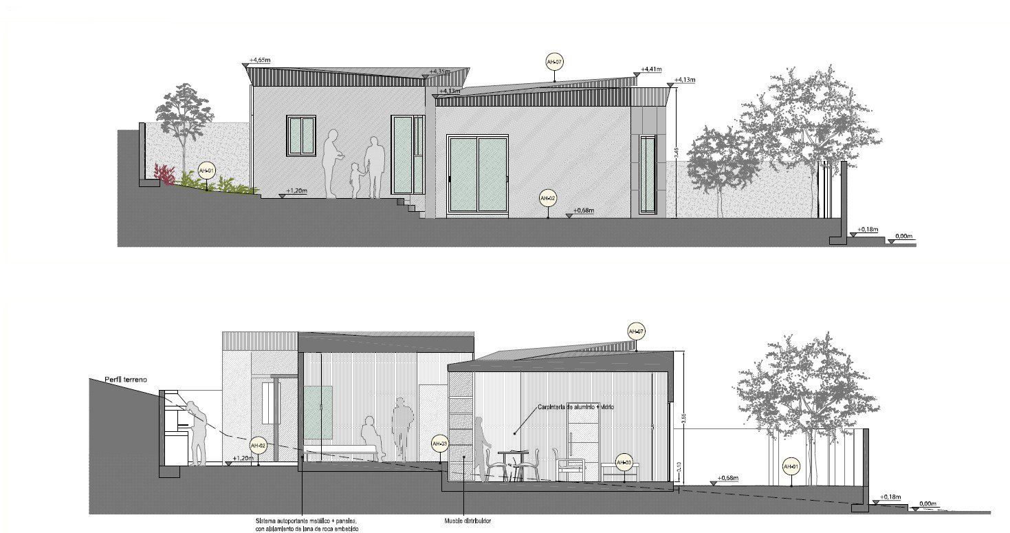 Proyecto de ejecución de vivienda unifamiliar en Granadilla, Tenerife, consistente en una construcción prefabricada que se adapta a la pendiente existente y cuenta con una serie de perforaciones para optimizar las vistas y la iluminación. La planta se organiza a partir de un mueble equipado lineal central al que se van adosando áreas funcionales.